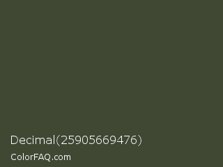 Decimal 25905669476 Color is a dark green color and the nearest color is Kelp #454936. Hex code #404834 and RGB value is rgb(64,72,52). In RGB color space, this color is composed of 25% red, 28% green, 20% blue, In CMYK color space, this color is composed of 11% cyan, 0% magenta, 28% yellow , 72% black , In HSL color space, this color has a hue angle of 84° , 16% saturation and 24% lightness.