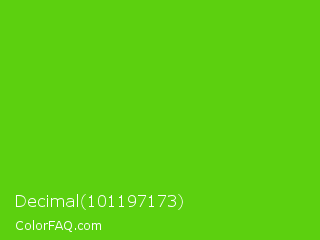 Decimal 101197173 Color is a normal green color and the nearest color is Harlequin Green #46cb18. Hex code #5cd00f and RGB value is rgb(92,208,15). In RGB color space, this color is composed of 36% red, 82% green, 6% blue, In CMYK color space, this color is composed of 56% cyan, 0% magenta, 93% yellow , 18% black , In HSL color space, this color has a hue angle of 96° , 87% saturation and 44% lightness.