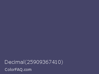 Decimal 25909367410 Color is a normal indigo color and the nearest color is Mulled Wine #4e4562. Hex code #454468 and RGB value is rgb(69,68,104). In RGB color space, this color is composed of 27% red, 27% green, 41% blue, In CMYK color space, this color is composed of 34% cyan, 35% magenta, 0% yellow , 59% black , In HSL color space, this color has a hue angle of 242° , 21% saturation and 34% lightness.