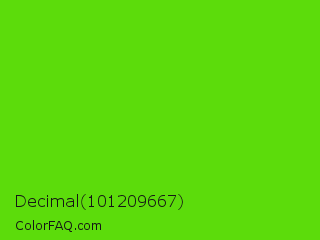 Decimal 101209667 Color is a normal green color and the nearest color is Harlequin Green #46cb18. Hex code #5cdc0b and RGB value is rgb(92,220,11). In RGB color space, this color is composed of 36% red, 86% green, 4% blue, In CMYK color space, this color is composed of 58% cyan, 0% magenta, 95% yellow , 14% black , In HSL color space, this color has a hue angle of 97° , 90% saturation and 45% lightness.