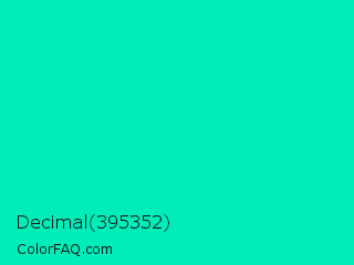 Decimal 395352 Color is a normal cyan color and the nearest color is Medium Spring Green #00fa9a. Hex code #00edba and RGB value is rgb(0,237,186). In RGB color space, this color is composed of 0% red, 93% green, 73% blue, In CMYK color space, this color is composed of 100% cyan, 0% magenta, 22% yellow , 7% black , In HSL color space, this color has a hue angle of 167° , 100% saturation and 46% lightness.