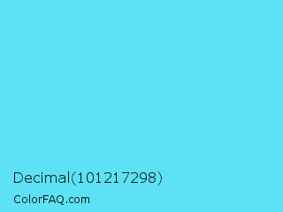 Decimal 101217298 Color is a light cyan color and the nearest color is Turquoise Blue #6cdae7. Hex code #5ce2f4 and RGB value is rgb(92,226,244). In RGB color space, this color is composed of 36% red, 89% green, 96% blue, In CMYK color space, this color is composed of 62% cyan, 7% magenta, 0% yellow , 4% black , In HSL color space, this color has a hue angle of 187° , 87% saturation and 66% lightness.