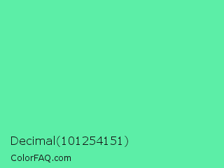 Decimal 101254151 Color is a light green color and the nearest color is Medium Aquamarine #66ddaa. Hex code #5ceea7 and RGB value is rgb(92,238,167). In RGB color space, this color is composed of 36% red, 93% green, 65% blue, In CMYK color space, this color is composed of 61% cyan, 0% magenta, 30% yellow , 7% black , In HSL color space, this color has a hue angle of 151° , 81% saturation and 65% lightness.