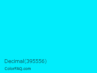Decimal 395556 Color is a normal cyan color and the nearest color is Cyan / Aqua #00ffff. Hex code #00edfc and RGB value is rgb(0,237,252). In RGB color space, this color is composed of 0% red, 93% green, 99% blue, In CMYK color space, this color is composed of 100% cyan, 6% magenta, 0% yellow , 1% black , In HSL color space, this color has a hue angle of 184° , 100% saturation and 49% lightness.