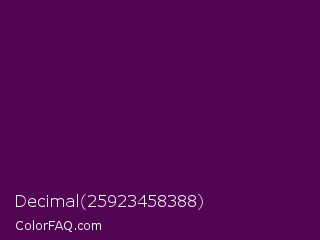 Decimal 25923458388 Color is a very dark magenta color and the nearest color is Clairvoyant #480656. Hex code #510552 and RGB value is rgb(81,5,82). In RGB color space, this color is composed of 32% red, 2% green, 32% blue, In CMYK color space, this color is composed of 1% cyan, 94% magenta, 0% yellow , 68% black , In HSL color space, this color has a hue angle of 299° , 89% saturation and 17% lightness.