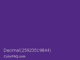Decimal 25923519844 Color is a normal violet color and the nearest color is KSU Purple #512888. Hex code #512884 and RGB value is rgb(81,40,132). In RGB color space, this color is composed of 32% red, 16% green, 52% blue, In CMYK color space, this color is composed of 39% cyan, 70% magenta, 0% yellow , 48% black , In HSL color space, this color has a hue angle of 267° , 53% saturation and 34% lightness.