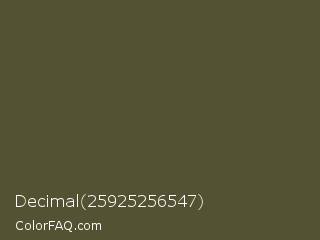 Decimal 25925256547 Color is a dark yellow color and the nearest color is Woodland #4d5328. Hex code #535333 and RGB value is rgb(83,83,51). In RGB color space, this color is composed of 33% red, 33% green, 20% blue, In CMYK color space, this color is composed of 0% cyan, 0% magenta, 39% yellow , 67% black , In HSL color space, this color has a hue angle of 60° , 24% saturation and 26% lightness.