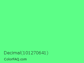 Decimal 101270641 Color is a light green color and the nearest color is Very Light Malachite Green #64e986. Hex code #5cfe87 and RGB value is rgb(92,254,135). In RGB color space, this color is composed of 36% red, 100% green, 53% blue, In CMYK color space, this color is composed of 64% cyan, 0% magenta, 47% yellow , 0% black , In HSL color space, this color has a hue angle of 136° , 99% saturation and 68% lightness.