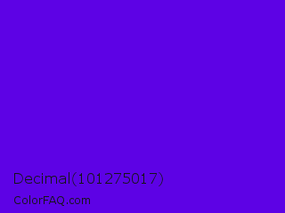 Decimal 101275017 Color is a normal violet color and the nearest color is Electric Indigo #6f00ff. Hex code #5d02e5 and RGB value is rgb(93,2,229). In RGB color space, this color is composed of 36% red, 1% green, 90% blue, In CMYK color space, this color is composed of 59% cyan, 99% magenta, 0% yellow , 10% black , In HSL color space, this color has a hue angle of 264° , 98% saturation and 45% lightness.