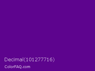 Decimal 101277716 Color is a dark purple color and the nearest color is Purple #660099. Hex code #5d048e and RGB value is rgb(93,4,142). In RGB color space, this color is composed of 36% red, 2% green, 56% blue, In CMYK color space, this color is composed of 35% cyan, 97% magenta, 0% yellow , 44% black , In HSL color space, this color has a hue angle of 279° , 95% saturation and 29% lightness.