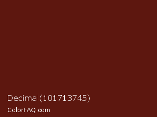 Decimal 101713745 Color is a very dark red color and the nearest color is Redwood #5d1e0f. Hex code #5d170f and RGB value is rgb(93,23,15). In RGB color space, this color is composed of 36% red, 9% green, 6% blue, In CMYK color space, this color is composed of 0% cyan, 75% magenta, 84% yellow , 64% black , In HSL color space, this color has a hue angle of 6° , 72% saturation and 21% lightness.
