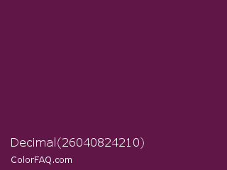 Decimal 26040824210 Color is a dark magenta color and the nearest color is Tawny Port #692545. Hex code #601748 and RGB value is rgb(96,23,72). In RGB color space, this color is composed of 38% red, 9% green, 28% blue, In CMYK color space, this color is composed of 0% cyan, 76% magenta, 25% yellow , 62% black , In HSL color space, this color has a hue angle of 320° , 61% saturation and 23% lightness.