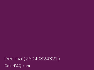 Decimal 26040824321 Color is a dark magenta color and the nearest color is Tawny Port #692545. Hex code #601751 and RGB value is rgb(96,23,81). In RGB color space, this color is composed of 38% red, 9% green, 32% blue, In CMYK color space, this color is composed of 0% cyan, 76% magenta, 16% yellow , 62% black , In HSL color space, this color has a hue angle of 312° , 61% saturation and 23% lightness.