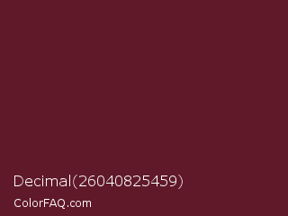 Decimal 26040825459 Color is a dark red color and the nearest color is Wine Berry #591d35. Hex code #601929 and RGB value is rgb(96,25,41). In RGB color space, this color is composed of 38% red, 10% green, 16% blue, In CMYK color space, this color is composed of 0% cyan, 74% magenta, 57% yellow , 62% black , In HSL color space, this color has a hue angle of 346° , 59% saturation and 24% lightness.