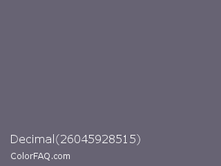 Decimal 26045928515 Color is a normal indigo color and the nearest color is Dolphin #646077. Hex code #676373 and RGB value is rgb(103,99,115). In RGB color space, this color is composed of 40% red, 39% green, 45% blue, In CMYK color space, this color is composed of 10% cyan, 14% magenta, 0% yellow , 55% black , In HSL color space, this color has a hue angle of 255° , 7% saturation and 42% lightness.
