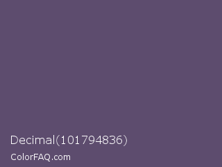 Decimal 101794836 Color is a normal violet color and the nearest color is Scarpa Flow #585562. Hex code #5d4c6e and RGB value is rgb(93,76,110). In RGB color space, this color is composed of 36% red, 30% green, 43% blue, In CMYK color space, this color is composed of 15% cyan, 31% magenta, 0% yellow , 57% black , In HSL color space, this color has a hue angle of 270° , 18% saturation and 36% lightness.