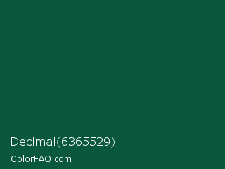 Decimal 6365529 Color is a very dark green color and the nearest color is Sacramento State Green #00563f. Hex code #09573f and RGB value is rgb(9,87,63). In RGB color space, this color is composed of 4% red, 34% green, 25% blue, In CMYK color space, this color is composed of 90% cyan, 0% magenta, 28% yellow , 66% black , In HSL color space, this color has a hue angle of 162° , 81% saturation and 19% lightness.