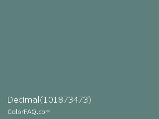 Decimal 101873473 Color is a normal cyan color and the nearest color is Wintergreen Dream #56887d. Hex code #5d807d and RGB value is rgb(93,128,125). In RGB color space, this color is composed of 36% red, 50% green, 49% blue, In CMYK color space, this color is composed of 27% cyan, 0% magenta, 2% yellow , 50% black , In HSL color space, this color has a hue angle of 175° , 16% saturation and 43% lightness.
