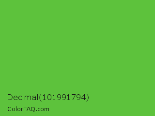 Decimal 101991794 Color is a normal green color and the nearest color is Green RYB #66b032. Hex code #5dc23c and RGB value is rgb(93,194,60). In RGB color space, this color is composed of 36% red, 76% green, 24% blue, In CMYK color space, this color is composed of 52% cyan, 0% magenta, 69% yellow , 24% black , In HSL color space, this color has a hue angle of 105° , 53% saturation and 50% lightness.