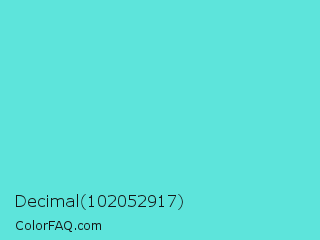 Decimal 102052917 Color is a light cyan color and the nearest color is Turquoise Blue #6cdae7. Hex code #5de4db and RGB value is rgb(93,228,219). In RGB color space, this color is composed of 36% red, 89% green, 86% blue, In CMYK color space, this color is composed of 59% cyan, 0% magenta, 4% yellow , 11% black , In HSL color space, this color has a hue angle of 176° , 71% saturation and 63% lightness.