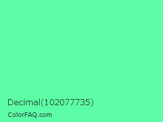 Decimal 102077735 Color is a light green color and the nearest color is Medium Aquamarine #66ddaa. Hex code #5dfca7 and RGB value is rgb(93,252,167). In RGB color space, this color is composed of 36% red, 99% green, 65% blue, In CMYK color space, this color is composed of 63% cyan, 0% magenta, 34% yellow , 1% black , In HSL color space, this color has a hue angle of 148° , 96% saturation and 68% lightness.