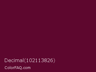 Decimal 102113826 Color is a very dark rose color and the nearest color is Mulberry Wood #5c0536. Hex code #5e072e and RGB value is rgb(94,7,46). In RGB color space, this color is composed of 37% red, 3% green, 18% blue, In CMYK color space, this color is composed of 0% cyan, 93% magenta, 51% yellow , 63% black , In HSL color space, this color has a hue angle of 333° , 86% saturation and 20% lightness.