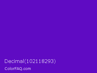 Decimal 102118293 Color is a normal violet color and the nearest color is Purple Heart Crayola #652dc1. Hex code #5e0bc3 and RGB value is rgb(94,11,195). In RGB color space, this color is composed of 37% red, 4% green, 76% blue, In CMYK color space, this color is composed of 52% cyan, 94% magenta, 0% yellow , 24% black , In HSL color space, this color has a hue angle of 267° , 89% saturation and 40% lightness.
