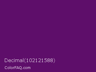 Decimal 102121588 Color is a dark magenta color and the nearest color is Honey Flower #4f1c70. Hex code #5e0e6a and RGB value is rgb(94,14,106). In RGB color space, this color is composed of 37% red, 5% green, 42% blue, In CMYK color space, this color is composed of 11% cyan, 87% magenta, 0% yellow , 58% black , In HSL color space, this color has a hue angle of 292° , 77% saturation and 24% lightness.
