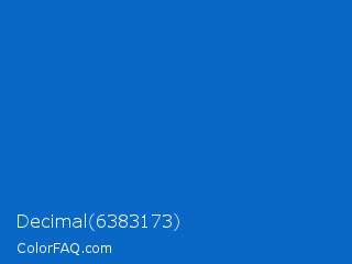 Decimal 6383173 Color is a normal blue color and the nearest color is Science Blue #0066cc. Hex code #0968c5 and RGB value is rgb(9,104,197). In RGB color space, this color is composed of 4% red, 41% green, 77% blue, In CMYK color space, this color is composed of 95% cyan, 47% magenta, 0% yellow , 23% black , In HSL color space, this color has a hue angle of 210° , 91% saturation and 40% lightness.