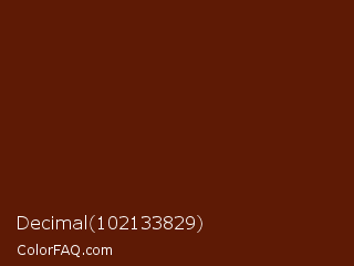 Decimal 102133829 Color is a very dark red color and the nearest color is Redwood #5d1e0f. Hex code #5e1a05 and RGB value is rgb(94,26,5). In RGB color space, this color is composed of 37% red, 10% green, 2% blue, In CMYK color space, this color is composed of 0% cyan, 72% magenta, 95% yellow , 63% black , In HSL color space, this color has a hue angle of 14° , 90% saturation and 19% lightness.