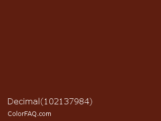 Decimal 102137984 Color is a very dark red color and the nearest color is Redwood #5d1e0f. Hex code #5e1e10 and RGB value is rgb(94,30,16). In RGB color space, this color is composed of 37% red, 12% green, 6% blue, In CMYK color space, this color is composed of 0% cyan, 68% magenta, 83% yellow , 63% black , In HSL color space, this color has a hue angle of 11° , 71% saturation and 22% lightness.