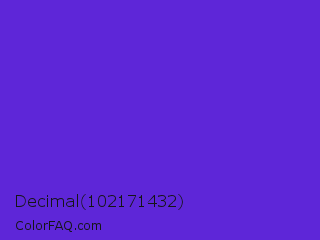 Decimal 102171432 Color is a normal indigo color and the nearest color is Purple Heart Crayola #652dc1. Hex code #5e26d8 and RGB value is rgb(94,38,216). In RGB color space, this color is composed of 37% red, 15% green, 85% blue, In CMYK color space, this color is composed of 56% cyan, 82% magenta, 0% yellow , 15% black , In HSL color space, this color has a hue angle of 259° , 70% saturation and 50% lightness.