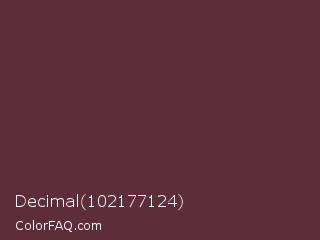 Decimal 102177124 Color is a dark rose color and the nearest color is Congo Brown #593737. Hex code #5e2d3c and RGB value is rgb(94,45,60). In RGB color space, this color is composed of 37% red, 18% green, 24% blue, In CMYK color space, this color is composed of 0% cyan, 52% magenta, 36% yellow , 63% black , In HSL color space, this color has a hue angle of 342° , 35% saturation and 27% lightness.