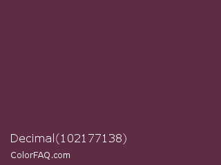 Decimal 102177138 Color is a dark rose color and the nearest color is Wine Dregs #673147. Hex code #5e2d44 and RGB value is rgb(94,45,68). In RGB color space, this color is composed of 37% red, 18% green, 27% blue, In CMYK color space, this color is composed of 0% cyan, 52% magenta, 28% yellow , 63% black , In HSL color space, this color has a hue angle of 332° , 35% saturation and 27% lightness.