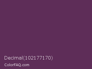 Decimal 102177170 Color is a dark magenta color and the nearest color is Japanese Violet #5b3256. Hex code #5e2d58 and RGB value is rgb(94,45,88). In RGB color space, this color is composed of 37% red, 18% green, 35% blue, In CMYK color space, this color is composed of 0% cyan, 52% magenta, 6% yellow , 63% black , In HSL color space, this color has a hue angle of 307° , 35% saturation and 27% lightness.