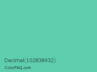 Decimal 102838932 Color is a normal green color and the nearest color is Medium Aquamarine #66ddaa. Hex code #5eceae and RGB value is rgb(94,206,174). In RGB color space, this color is composed of 37% red, 81% green, 68% blue, In CMYK color space, this color is composed of 54% cyan, 0% magenta, 16% yellow , 19% black , In HSL color space, this color has a hue angle of 163° , 53% saturation and 59% lightness.