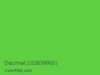 Decimal 102839960 Color is a normal green color and the nearest color is Green RYB #66b032. Hex code #5ed042 and RGB value is rgb(94,208,66). In RGB color space, this color is composed of 37% red, 82% green, 26% blue, In CMYK color space, this color is composed of 55% cyan, 0% magenta, 68% yellow , 18% black , In HSL color space, this color has a hue angle of 108° , 60% saturation and 54% lightness.