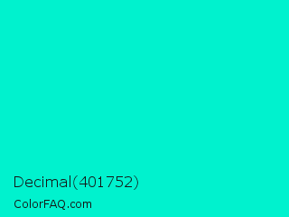 Decimal 401752 Color is a normal cyan color and the nearest color is Bright Turquoise #08e8de. Hex code #00f2ce and RGB value is rgb(0,242,206). In RGB color space, this color is composed of 0% red, 95% green, 81% blue, In CMYK color space, this color is composed of 100% cyan, 0% magenta, 15% yellow , 5% black , In HSL color space, this color has a hue angle of 171° , 100% saturation and 47% lightness.