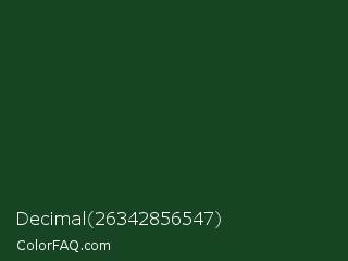 Decimal 26342856547 Color is a very dark green color and the nearest color is Everglade #1c402e. Hex code #174423 and RGB value is rgb(23,68,35). In RGB color space, this color is composed of 9% red, 27% green, 14% blue, In CMYK color space, this color is composed of 66% cyan, 0% magenta, 49% yellow , 73% black , In HSL color space, this color has a hue angle of 136° , 49% saturation and 18% lightness.