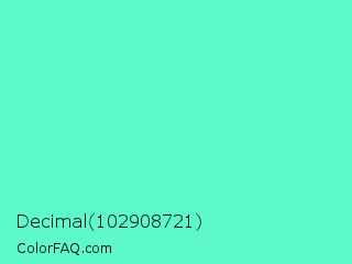 Decimal 102908721 Color is a light green color and the nearest color is Aquamarine #7fffd4. Hex code #5ef9cb and RGB value is rgb(94,249,203). In RGB color space, this color is composed of 37% red, 98% green, 80% blue, In CMYK color space, this color is composed of 62% cyan, 0% magenta, 18% yellow , 2% black , In HSL color space, this color has a hue angle of 162° , 93% saturation and 67% lightness.