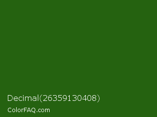 Decimal 26359130408 Color is a very dark green color and the nearest color is Green House #24500f. Hex code #256210 and RGB value is rgb(37,98,16). In RGB color space, this color is composed of 15% red, 38% green, 6% blue, In CMYK color space, this color is composed of 62% cyan, 0% magenta, 84% yellow , 62% black , In HSL color space, this color has a hue angle of 105° , 72% saturation and 22% lightness.