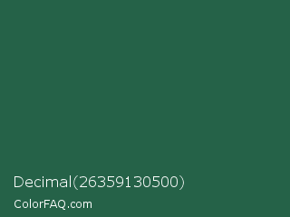 Decimal 26359130500 Color is a dark green color and the nearest color is Green Pea #1d6142. Hex code #256248 and RGB value is rgb(37,98,72). In RGB color space, this color is composed of 15% red, 38% green, 28% blue, In CMYK color space, this color is composed of 62% cyan, 0% magenta, 27% yellow , 62% black , In HSL color space, this color has a hue angle of 154° , 45% saturation and 26% lightness.