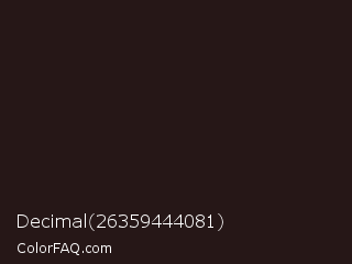 Decimal 26359444081 Color is a very dark red color and the nearest color is Gondola #261414. Hex code #261717 and RGB value is rgb(38,23,23). In RGB color space, this color is composed of 15% red, 9% green, 9% blue, In CMYK color space, this color is composed of 0% cyan, 39% magenta, 39% yellow , 85% black , In HSL color space, this color has a hue angle of 0° , 25% saturation and 12% lightness.