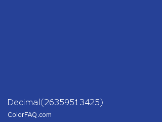 Decimal 26359513425 Color is a normal blue color and the nearest color is Blue Pigment #333399. Hex code #264197 and RGB value is rgb(38,65,151). In RGB color space, this color is composed of 15% red, 25% green, 59% blue, In CMYK color space, this color is composed of 75% cyan, 57% magenta, 0% yellow , 41% black , In HSL color space, this color has a hue angle of 226° , 60% saturation and 37% lightness.
