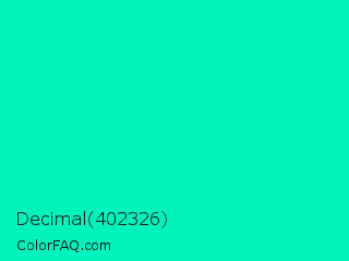 Decimal 402326 Color is a normal cyan color and the nearest color is Medium Spring Green #00fa9a. Hex code #00f3bc and RGB value is rgb(0,243,188). In RGB color space, this color is composed of 0% red, 95% green, 74% blue, In CMYK color space, this color is composed of 100% cyan, 0% magenta, 23% yellow , 5% black , In HSL color space, this color has a hue angle of 166° , 100% saturation and 48% lightness.