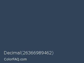 Decimal 26366989462 Color is a dark blue color and the nearest color is Pickled Bluewood #314459. Hex code #314358 and RGB value is rgb(49,67,88). In RGB color space, this color is composed of 19% red, 26% green, 35% blue, In CMYK color space, this color is composed of 44% cyan, 24% magenta, 0% yellow , 65% black , In HSL color space, this color has a hue angle of 212° , 28% saturation and 27% lightness.