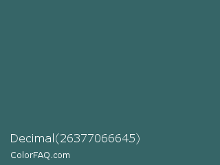 Decimal 26377066645 Color is a normal cyan color and the nearest color is William #3a686c. Hex code #366567 and RGB value is rgb(54,101,103). In RGB color space, this color is composed of 21% red, 40% green, 40% blue, In CMYK color space, this color is composed of 48% cyan, 2% magenta, 0% yellow , 60% black , In HSL color space, this color has a hue angle of 182° , 31% saturation and 31% lightness.