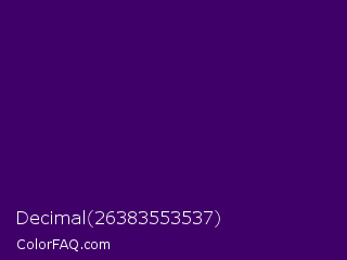 Decimal 26383553537 Color is a very dark purple color and the nearest color is Deep Violet #330066. Hex code #400069 and RGB value is rgb(64,0,105). In RGB color space, this color is composed of 25% red, 0% green, 41% blue, In CMYK color space, this color is composed of 39% cyan, 100% magenta, 0% yellow , 59% black , In HSL color space, this color has a hue angle of 277° , 100% saturation and 21% lightness.