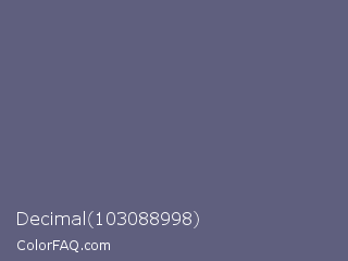 Decimal 103088998 Color is a normal blue color and the nearest color is Dolphin #646077. Hex code #5f5f7e and RGB value is rgb(95,95,126). In RGB color space, this color is composed of 37% red, 37% green, 49% blue, In CMYK color space, this color is composed of 25% cyan, 25% magenta, 0% yellow , 51% black , In HSL color space, this color has a hue angle of 240° , 14% saturation and 43% lightness.