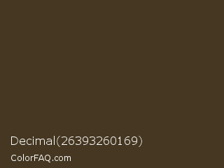Decimal 26393260169 Color is a very dark orange color and the nearest color is Lisbon Brown #423921. Hex code #453721 and RGB value is rgb(69,55,33). In RGB color space, this color is composed of 27% red, 22% green, 13% blue, In CMYK color space, this color is composed of 0% cyan, 20% magenta, 52% yellow , 73% black , In HSL color space, this color has a hue angle of 37° , 35% saturation and 20% lightness.